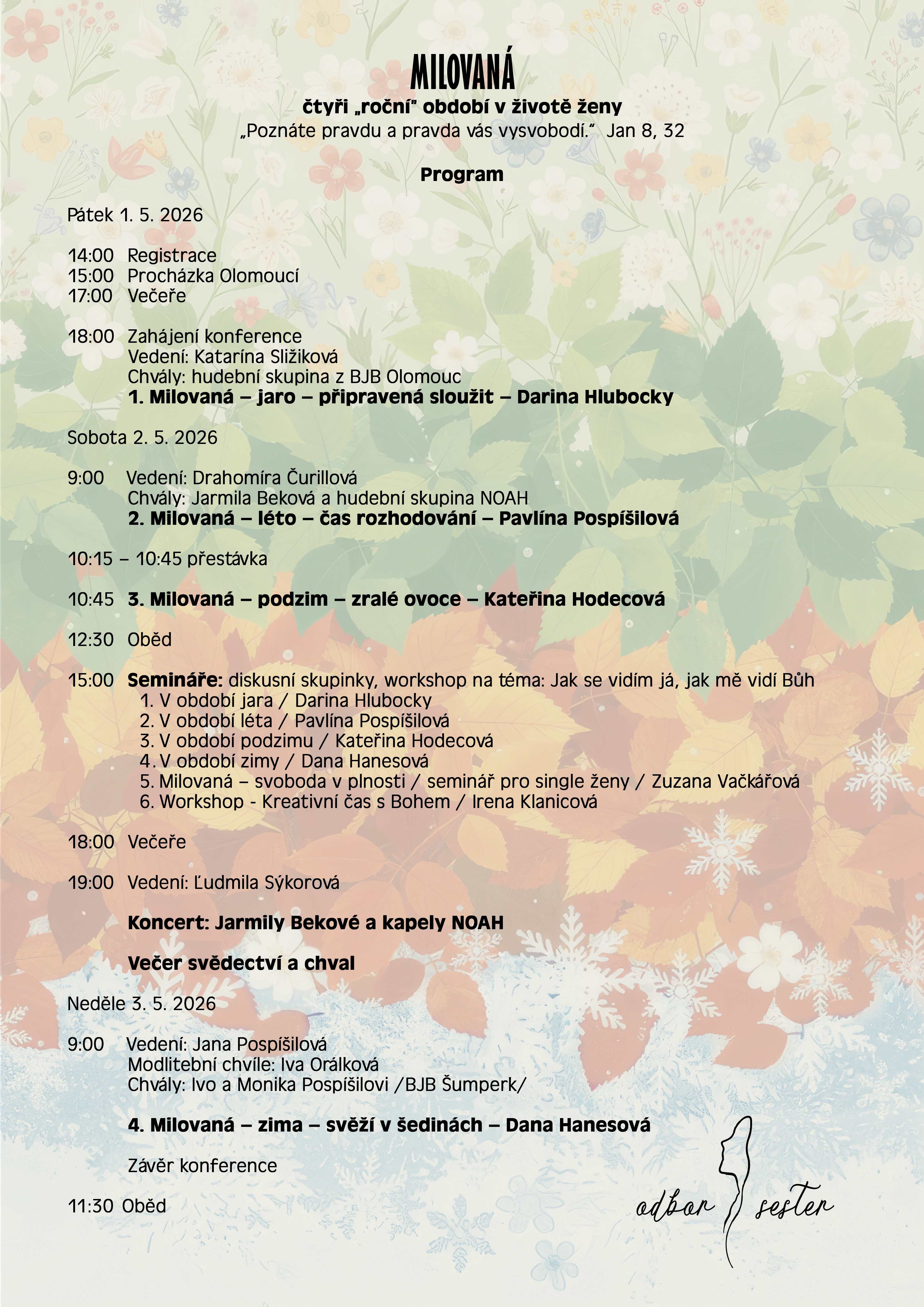 dovolte mi, všechny Vás co nejsrdečněji pozvat na společnou konferenci pro ženy Bratrské jednoty baptistů z ČR a SR, která se letos bude konat 1. – 3. května 2026 v Olomouci.